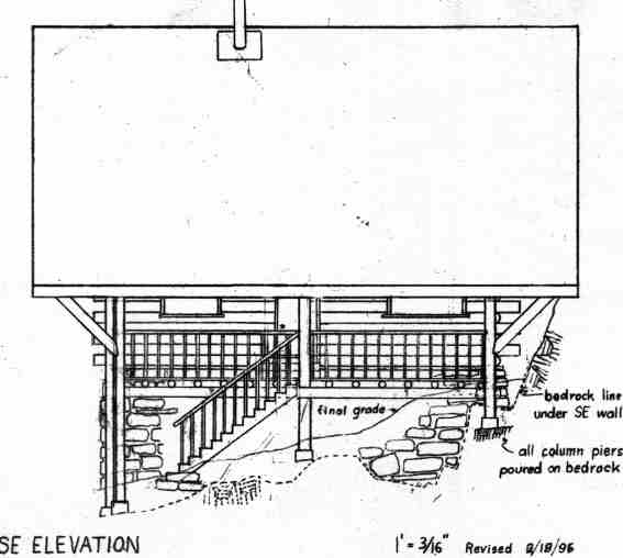 This drawing shows an edge-view of the porch deck and the front door of the house. It also shows the configuration of the bedrock under the southeast wall and going up to the cliff behind the house. That dashed line is to scale and very accurate. You can see a cross-section profile of the ledge the northeast wall is built on right behind the rightmost column in the picture. Again, the knee braces shown were not built.