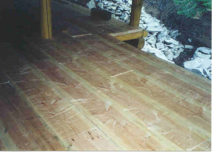 This picture shows the porch deck planks after they were fitted but before they were fastened down or stained.