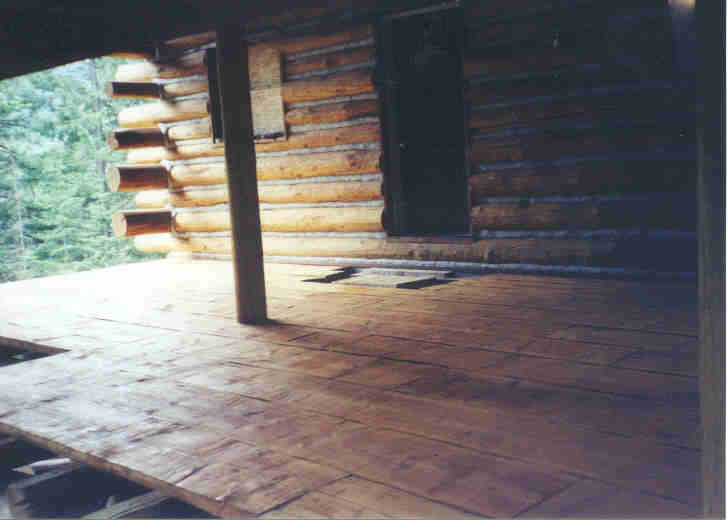 These pictures show the recent projects of building the porch deck and resuming the chinking on the outside of the building.