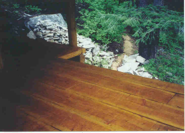 Here are the planks after they have been fastened down and stained. You can see planer chips on one of the trails leading into the woods.
