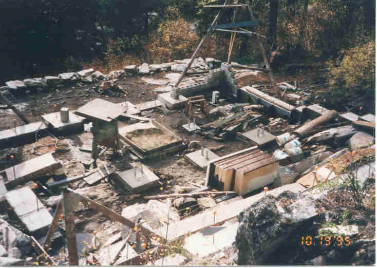 I had a concrete truck and a big pumper come in to do the footing pour, but I mixed and poured the concrete myself for the four column footing pads inside the building. You can see them in the center of the picture with the prongs of the the CB88s sticking up out of them. You can also see the start of the concrete block foundation wall in the far corner.