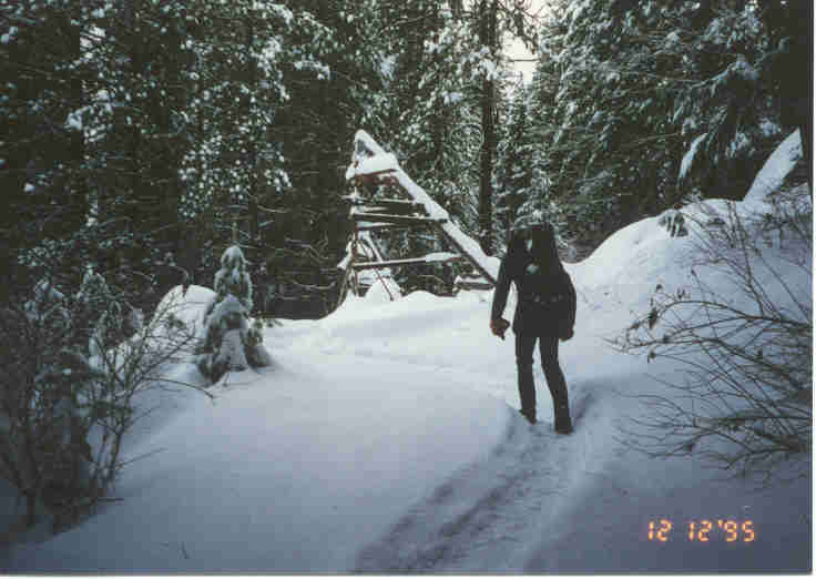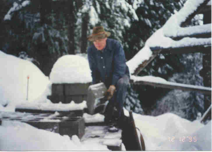 When it got too cold to do masonry work, I began stockpiling concrete blocks in the building site. I would haul 30 or 40 blocks up there in my pickup each week and then carry them up to the building site from the pickup parked just off the White River Road. Here you see me carrying one in my Trapper Nelson backpack up past the trailer.
