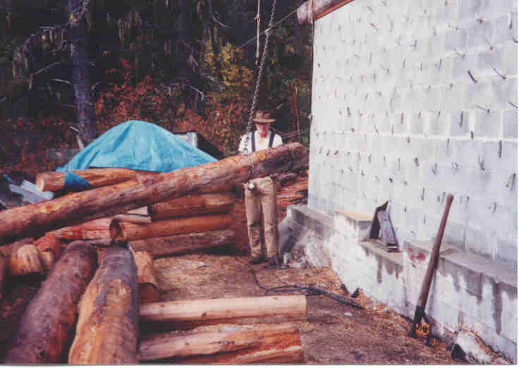 The log is lying on the roadway. Paul is chaining the end to the foundation wall.