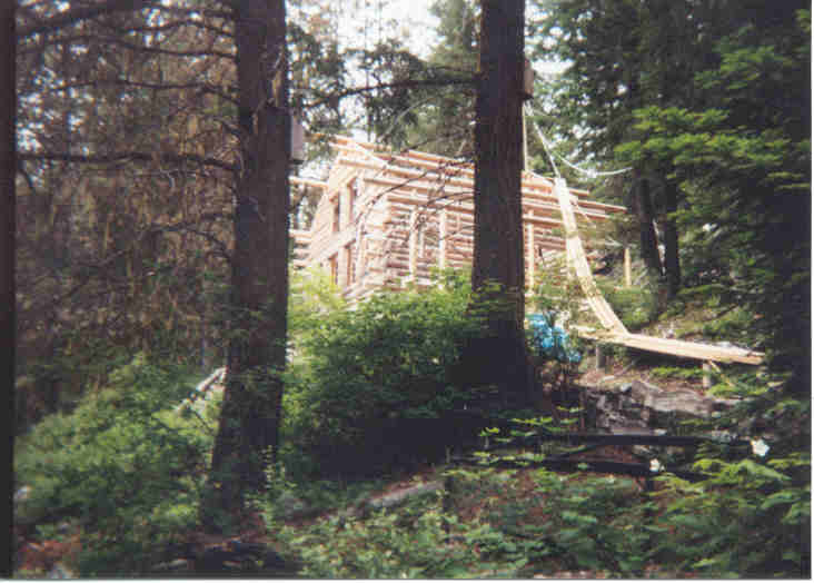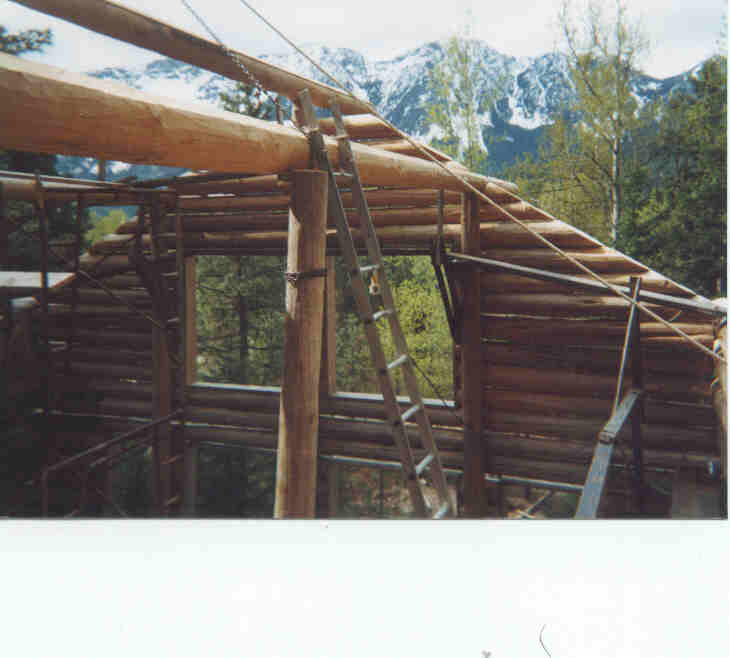 Some 40-foot rafters are staged part way up the roadway. I stopped doing that after a while. (If you are interested in how I eventually installed these rafters, take a look at my ninety step procedure.)