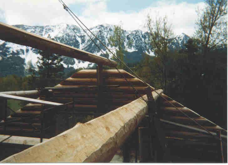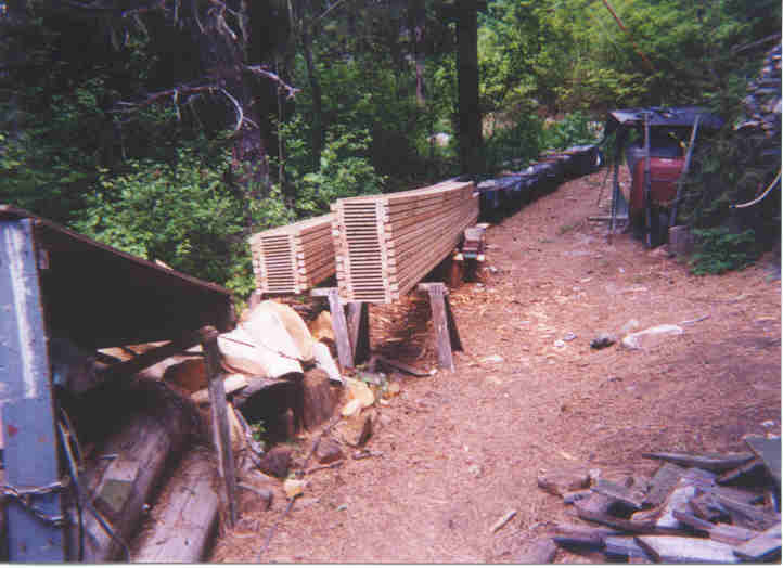 June 9, 1999. The rafters and OSB roof sheathing were delivered. The 40-footers are in the foreground, the OSB to the left of them, and the 24-foot rafters are at the top left.