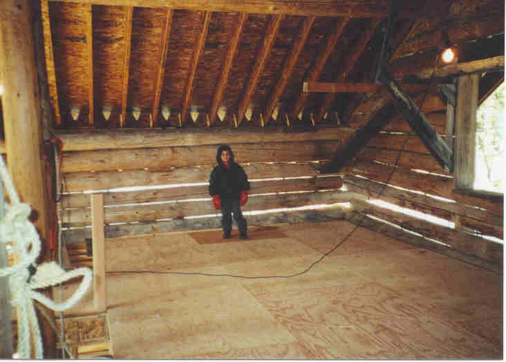 Andrew in the loft on the scaffolding left from building the gable wall. 1/14/01