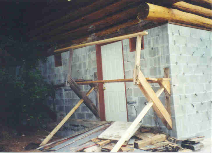 The scaffolding for planing and staining the lower northwest wall. The scaffold brackets were designed to be supported either by a bolt through the log wall, or by a 2x4 running to the ground as shown here. 9/25/01