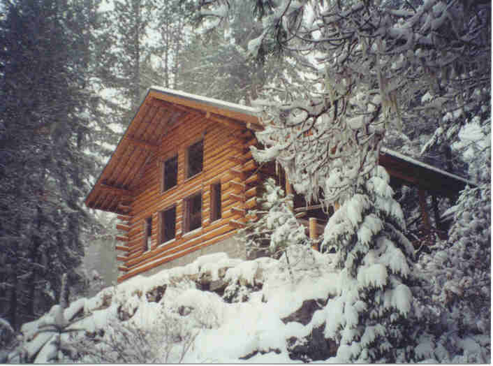 The Grid F.5,3 post for the porch beam is barely visible here between the trees. It is just to the right of center in the picture. The snow had blown into the cracks in the log walls and it looks like I hoped the chinking would someday look. 11/28/01