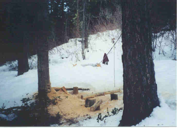 This is the gwiz station. Once the planks are ripped, they are skidded down here. This is where I gwiz them with this gwizard. ("Gwizard" is my contraction of "Log Wizard", which is the commercial name of the 3 1/4" planer attachment you see mounted on the end of the chainsaw bar. I also coined the verb "to gwiz" meaning to operate the gwizard so as to make a draw-knife-like finish on a log or plank.) I hang the gwizard from a sling attached overhead. The sling has an adjustable knot on it so I can easily adjust the height of the gwizard. The sling carries most of the weight of the saw so that I can direct my efforts to keeping it aligned and moving properly as well as controlling the RPMs of the saw. There are a lot of things to pay attention to when gwizzing, and it takes a while to get the hang of it. After going through two complete sets of blades and one set of bearings, I can say that I have gotten the hang of this thing, and I am pretty good at gwizzing.