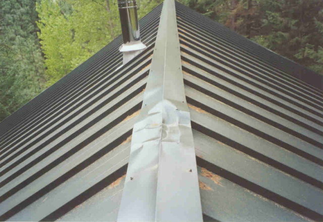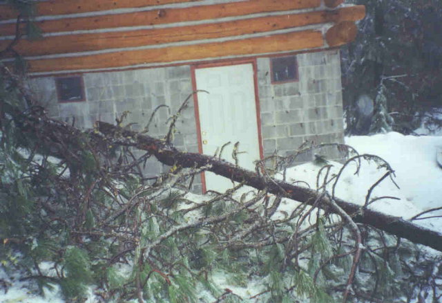 Here you can see the damage done to the ridge by that first tree falling on it. I went up on the roof and repaired the damage on 5/04/05.