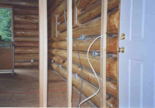 The major projects for 2005 were to finish varnishing the first floor log walls and to chink as much of the first floor as possible. I also did some additional plumbing on the water line from the spring, I trimmed the inside of all the first floor windows, I installed the EMT and outlet boxes for all the first floor receptacles in the log walls, and I installed most of the receptacles in the living room and dining room. Varnishing and chinking turned out to be a lot of long tedious work.