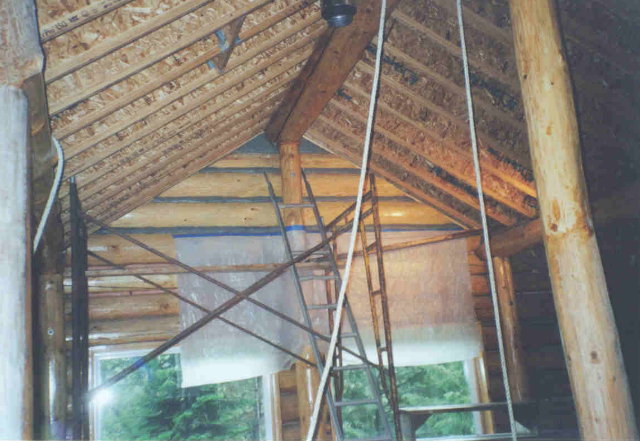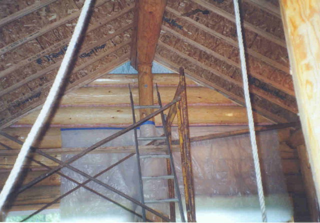 I got started chinking the inside on 6/8/05. Here you see the scaffold tower reaching to the gable peak where I started the chinking.
