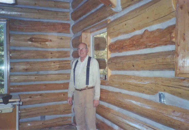 By 9/28/05 the chinking was done in the living room, the dining room, the kitchen, and half of the utility room. Here I am standing in the corner of the dining room with part of the kitchen wall on the right.