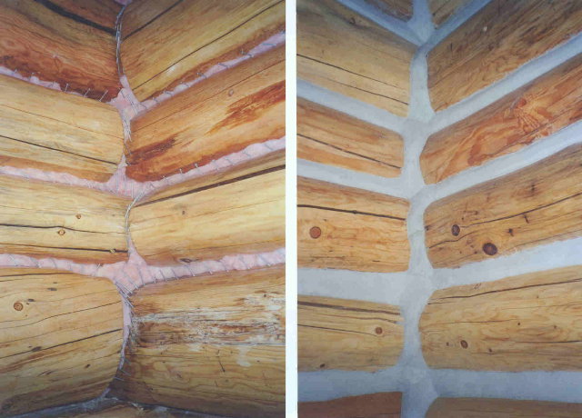 Here are close up pictures of a corner before and after chinking. (They are two different corners; the one on the left is the utility room and the one on the right is the dining room.) You can barely see the pattern of nails that holds the mortar in place. The pictures were taken on 9/28/05.