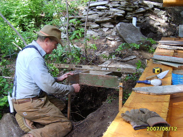 6/12/07 Here he is positioning and levelling the pinwheel over the hole in the ground.