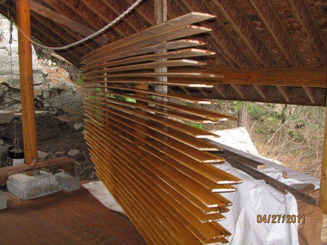 4/13/11 The tongue and goove 1x8 pine paneling boards are stockpiled on the front porch awaiting varnish or stain before they will be installed on the ceilings inside and out.