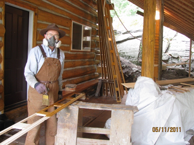 4/27/11 In spite of the breeze, after while, the fumes from the stain got bad enough that I put a respirator on. It was also chilly so I put a jacket on.