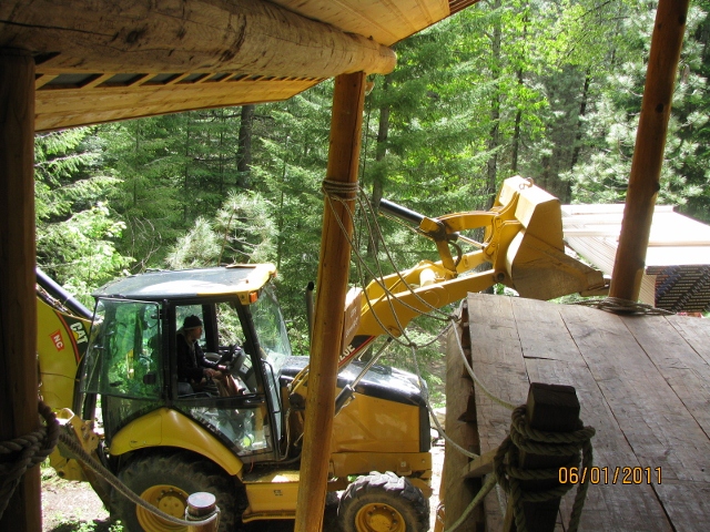 6/1/11 Here the load of drywall is arriving at the upper roadway on a set of forks sticking out from the bucket on Mike's front loader.