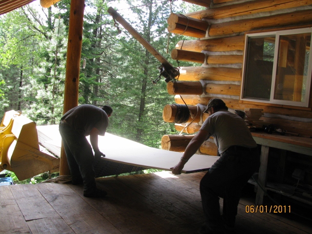 6/1/11 The drywall load is on the ground in the lower parking area covered with tarps. My truck is parked off to the side to make room for Mike to get his front loader in to pick up the drywall and bring it up to the cabin.