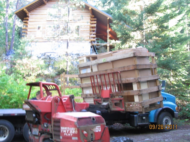 9/28/11 The delivery guy starting to unload the cabinets and carry them into the cabin.