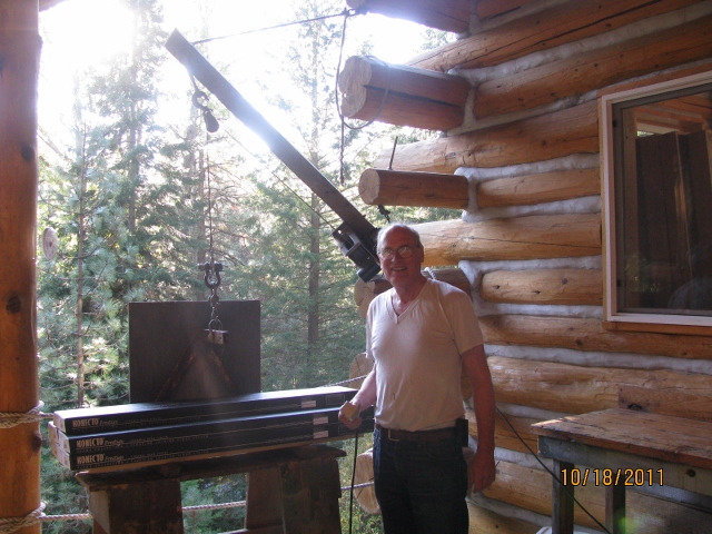10/18/11 After the first 3-box load, I switched to lifting 5 boxes at a time which together with the sling weighed about 250 lb. Again, the crane had no trouble lifting it. I got overheated so I took off my shirt and hat. Here a 5-box load is clearing the porch railing rope.