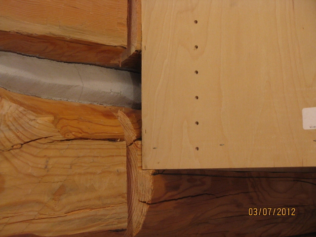 3/7/12 This detail shows how the wall log was cut to form a ledge to help support the cabinet above the refrigerator.