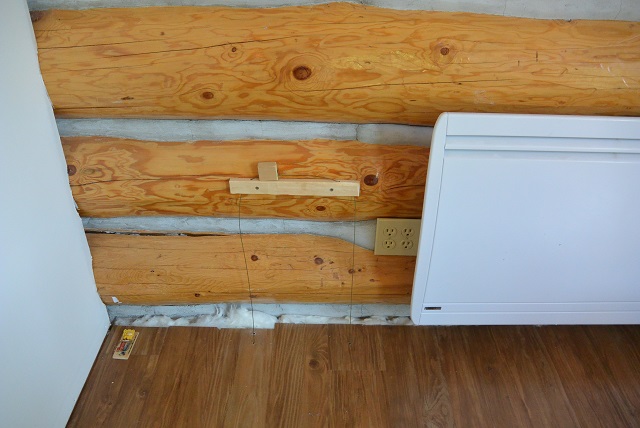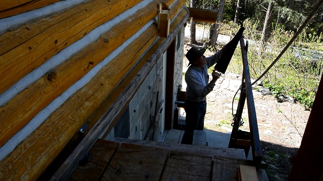 4/13/16 Work has started on the installation of the log slab treads on the back staircase. Here you can see (if you work at it) the two horizontal gauge rails suspended over the sides of the staircase. These provide a reference for locating the horizontal position of the noses of the treads as well as the vertical position of the tread surfaces of the treads. Here I am sawing small notches at each of the marks marking the position of the tread noses. The notches will make sure that the plumb bob strings stay where they are supposed to.