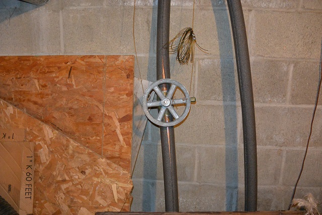 6/28/16 This valve is a project of convenience. For many years, I controlled the water pressure in the cabin by operating a valve down at the creek. When I was gone home, I opened the valve all the way and let the water from the spring run freely into the creek. That kept the water fresh and prevented freeze-up in the winter. But when I was in the cabin, I had to close the valve all the way shut, or almost all the way, in order to get water pressure in the cabin. I left it cracked open a little in winter to keep the line from freezing. Later, I started controlling the pressure by using the valve in the crawl space that you see here behind the pulley wheel. Now, this week I installed that pulley wheel attached to the valve handle with cables running up from the wheel into the living room where I can now operate the valve remotely. This was an idea suggested by Bill some time ago. It was a great idea. I designed and built the parts in Seattle so the installation didn't interfere too much with my work at Camp Serendipity.