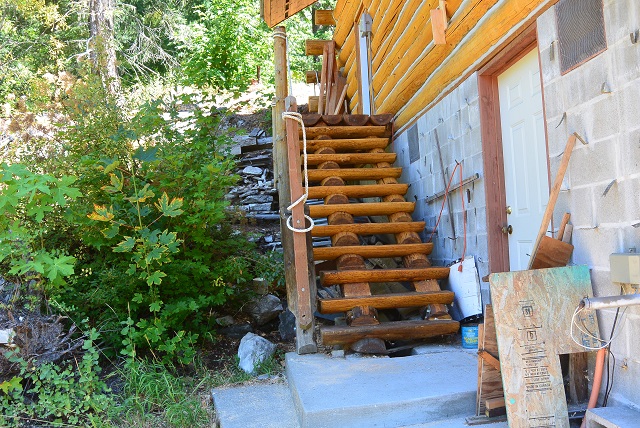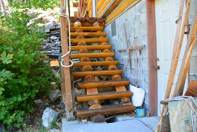 6/2/16 Four log slab stair treads are in place in the back staircase and the fifth tread blank slab is suspended over the stringers in position for scribing. After scribing, the tread blank and both stringers will be notched so that the tread fits securely in the staircase where it belongs.