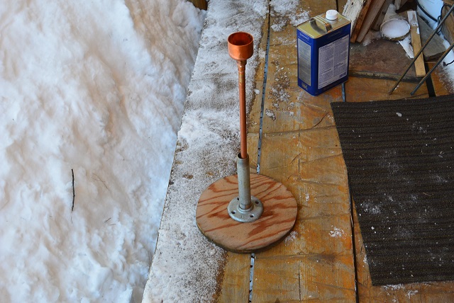 1/5/17 Paul with a rebar baluster ready to dip it in the cleaning bath. The tank contains paint thinner. The cleaned rebar will then be painted.
