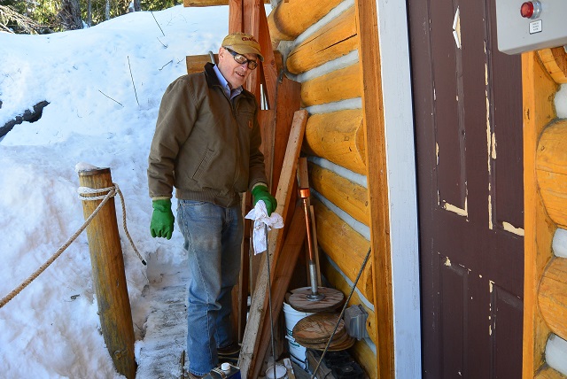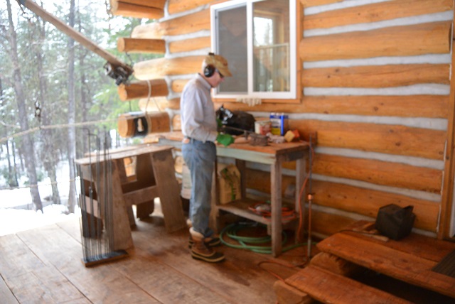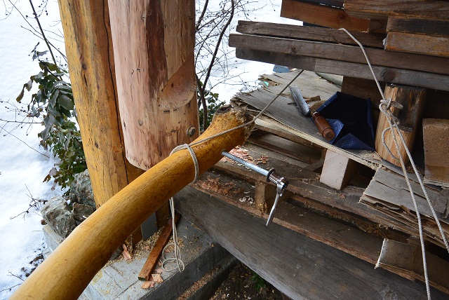 2/10/17 Here you can see that the holes have been drilled for the lag screw, the lag screw is started through the rail and the wrench is hanging from the lag screw ready to fasten the rail to the scab log.