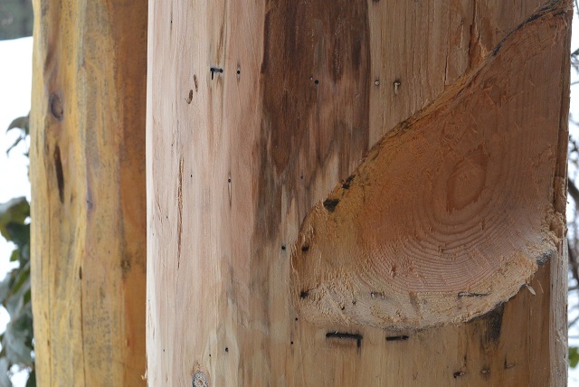 2/10/17 Here the bottom of the rail is securely fastened to the scab log on the Grid F3 column.