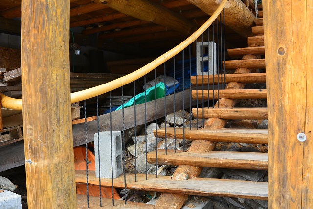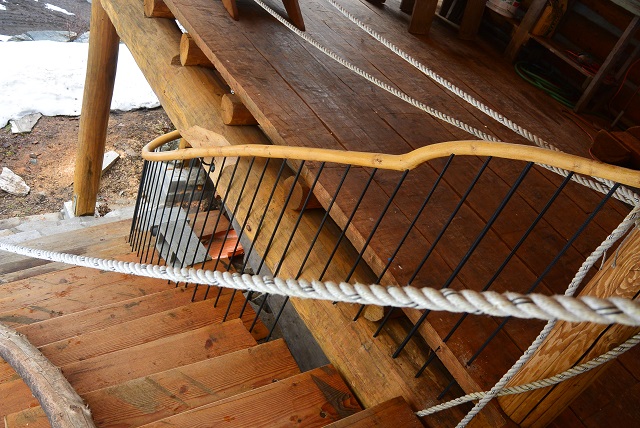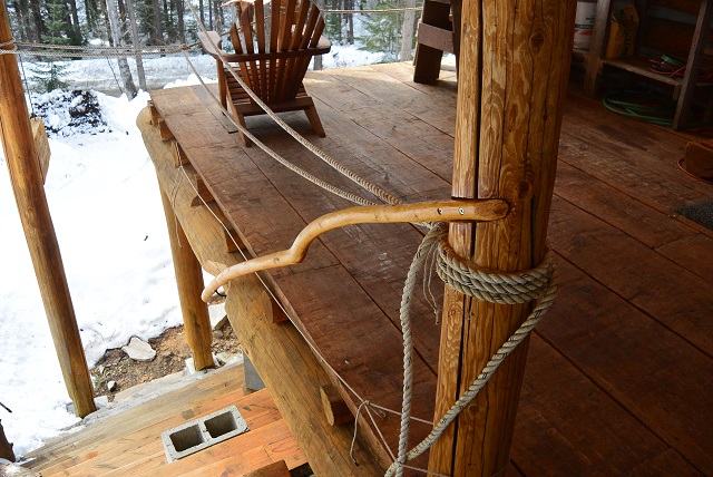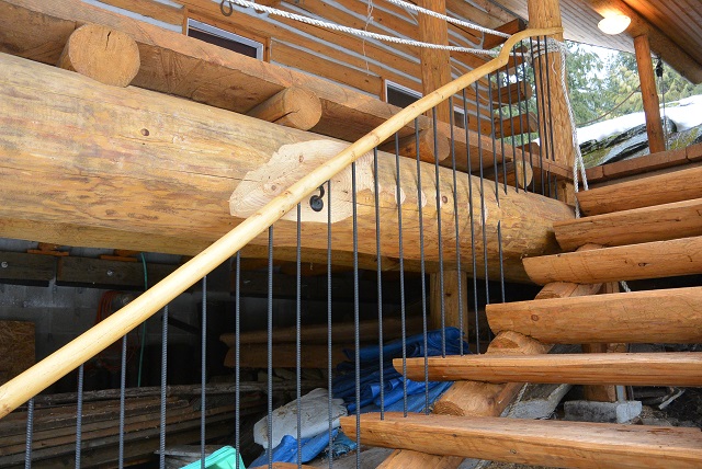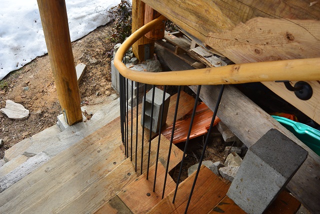 2/10/17 The vine maple handrail on the front staircase is temporarily held in place by ropes and the center rail bracket.