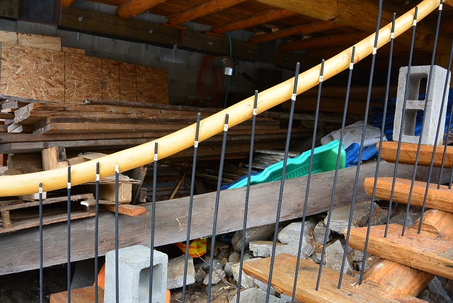 3/29/17 This picture shows the baluster prep process. The balusters are already cut to length and lying on the sawhorses. Each one has its ID written on a piece of tape. To prepare them I take the next one in sequence from the sawhorses and dress the ends. I do that by hammering the burs and sharp edges using the hammer I am holding and the short section of railroad rail you see as an anvil. That makes the ends of the rebar go into the holes more easily. Then I soak half of the baluster in the copper tank full of paint thinner. (You can see the skinny tank with a baluster soaking in it to the right in the picture.) Then I wipe the soaked end of the rebar clean with a rag and then soak the other end and wipe that clean. Finally I drive the rebar into the next hole in the painting rack which you see on the left. When they are all cleaned and in the rack, I carry the entire rack down below and spray on the primer and paint. When they are dry, I take them out one by one in sequence and place them in the staircase rail system.