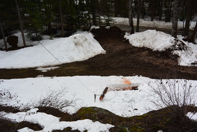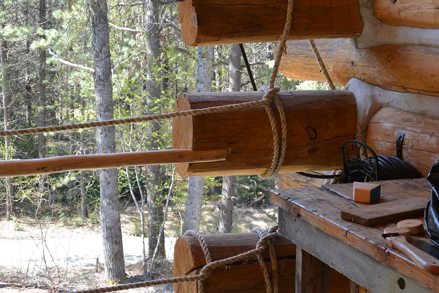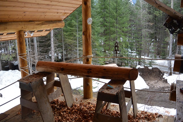 4/5/17 Building the railing system for the porch deck starts with the harvesting of a log from the end of the gate log. Here you see that the log has been cut and the porch crane is rigged to drag it up onto the porch deck.