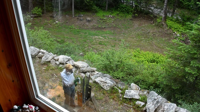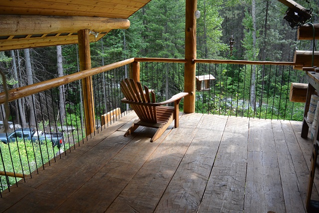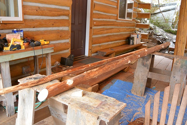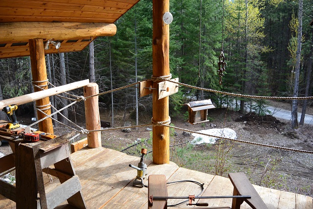 6/7/17 Except for the spaces between the projecting wall logs, the railings on this end of the porch are finished.