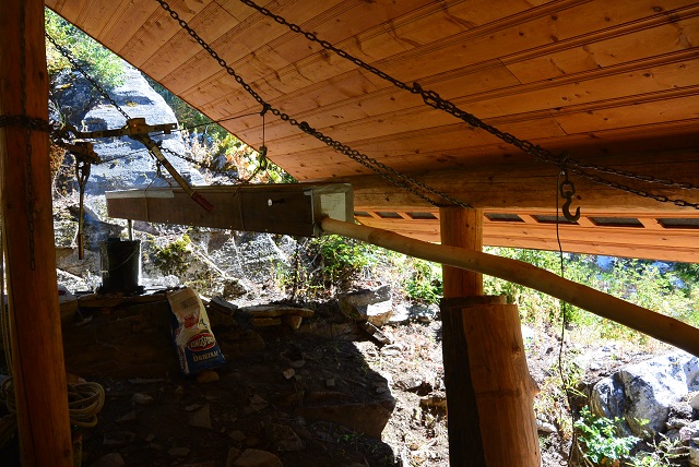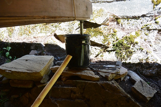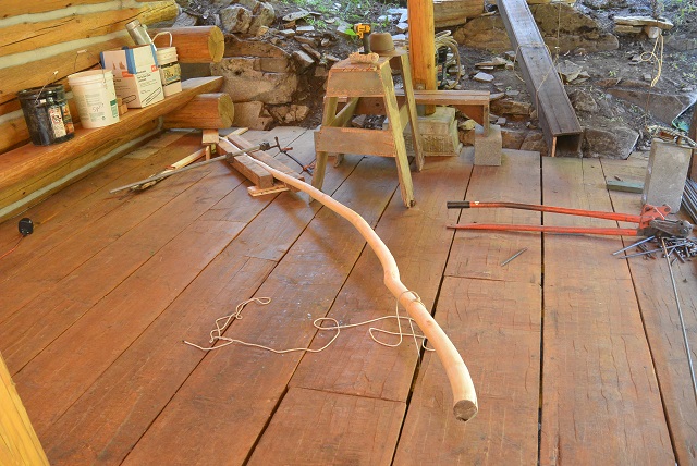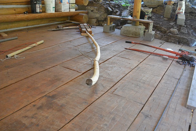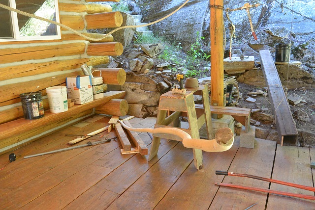 7/12/17 After changing my mind several times and after considering several different options for the outside front staircase rail, I settled on a vine maple that sort of matches the one on the other side. The vine maple was very crooked, and while it could have been used as is, I decided to steam bend it to try to straighten it at least a little. And after researching steam bending on YouTube, I settled on a method. I planned to use a steam box made of four cedar 1x8s screwed together. The steam would be produced in a 5-gallon bucket heated by a charcoal fire on the hearth the scouts built and used for their charcoal fires. Here you can see some of the parts. The steam box has one end up on the hearth and the bucket is sitting on the hearth. The crooked vine maple rail is rising up from the porch deck because the small end is wedged under the projecting wall log to the left of the picture. The curvature that I want to take out of the rail is what is holding the thing up off the deck.