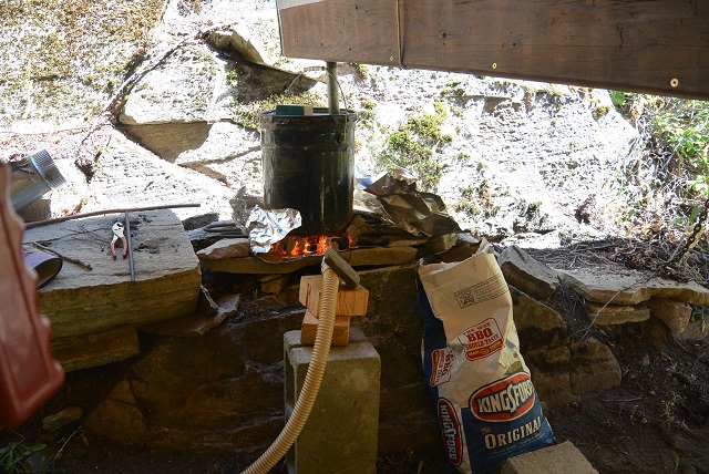 7/19/17 The steam was delivered to the box via the vertical pipe you see coming out of the boiler. The charcoal fire is kept flaring by the hair dryer hose blowing air through a vacuum cleaner nozzle.