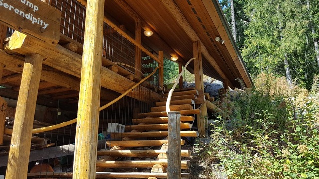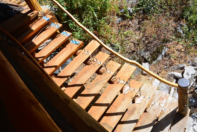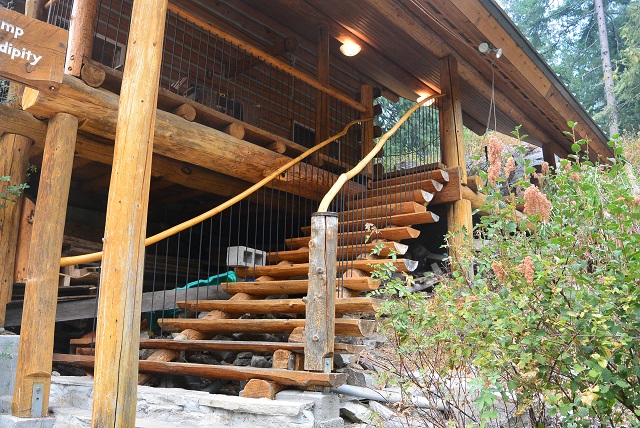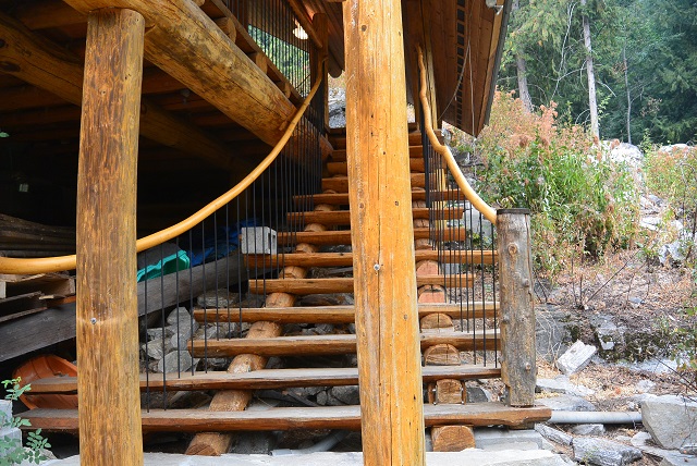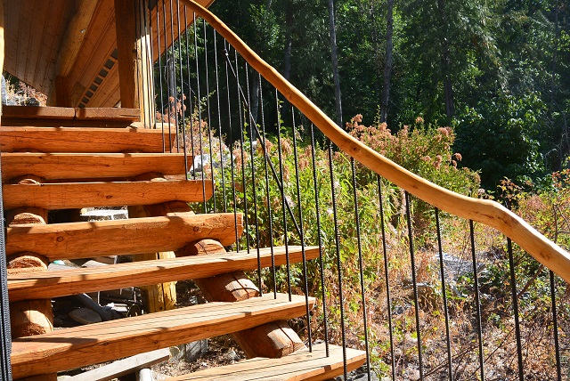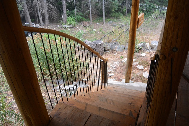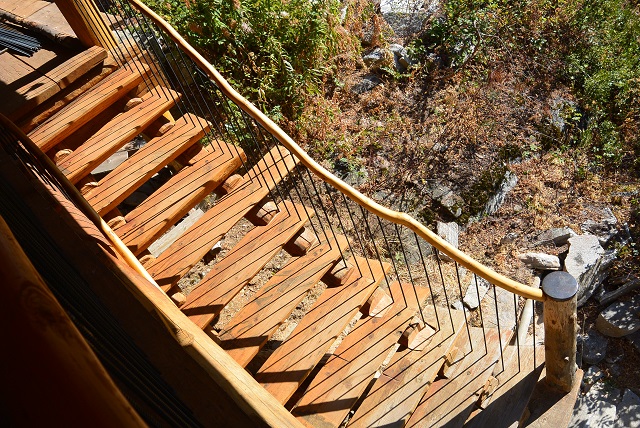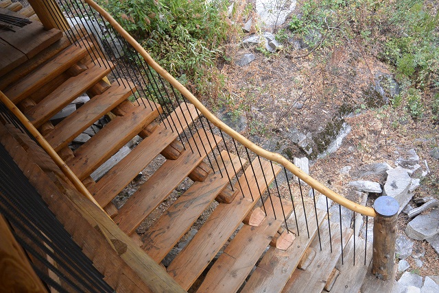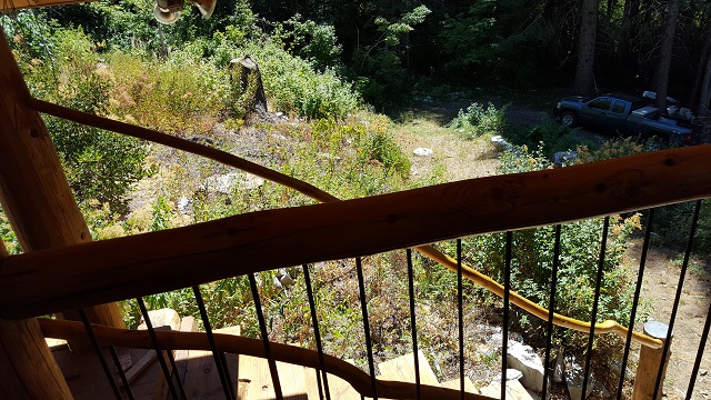 9/6/17 The front staircase seen as you approach from the roadway. There is still some trimming and staining to do, and I'll install a brace mid-span, but most of the work is done.