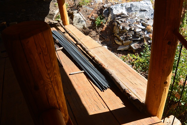 9/14/17 In this picture you can see a few things related to this week's work: There is the stack of thirty 10-foot lengths of #3 rebar that I carried up from the truck. The interesting thing is how clean the rebar is. There is not a speck on rust of any of them. The rusty ones on the right were from the previous batch. The next thing is the pole that will become the guard rail in that location. It obviously needs work. And the last thing is a stroke of serendipity, the two planks on the right that extend the deck. As it was, the deck did not reach far enough to hold the balusters in the position I wanted them. After some searching I found two old planks that were left over from making the porch deck many years ago. They just happened to be exactly the right size so I placed them where you see them without any cutting whatsoever. I screwed them down to the joists and plugged the holes with dowels that you can see if you look closely. What luck!