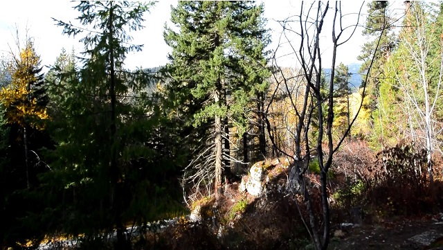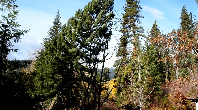 10/30/18 This week, three huge Doug fir trees were felled. Two of them are at the center of this picture--the one in the center, and the darker one just behind it. The front one has been notched in front and is ready to fall.