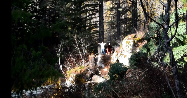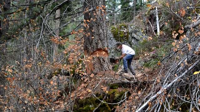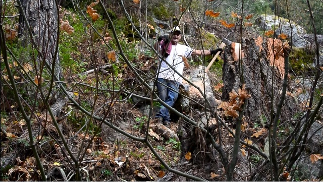 10/30/18 Here Robert is posing with the stump of the second tree. You can see the notch in the stump that held the jack. Both of these trees had to be jacked in order to get them to fall the right way.