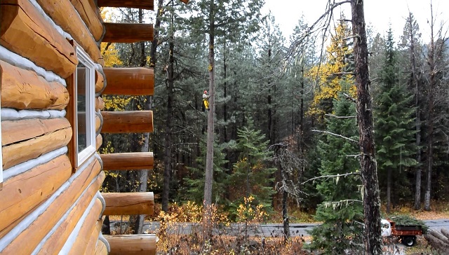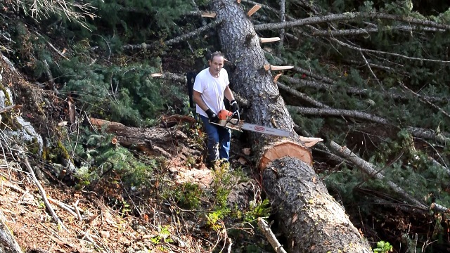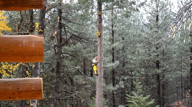 10/31/18 Robert is climbing the spar tree in order to retrieve the two blocks (pulleys) that are still holding cables.