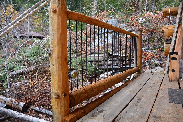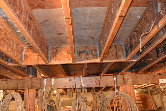 12/19/18 With winter weather here, priority has shifted away from railings, logging, and drying the crawl space to the blocking required behind TJI joist hangers. Here you see several of the joist hangers before the blocking was installed.