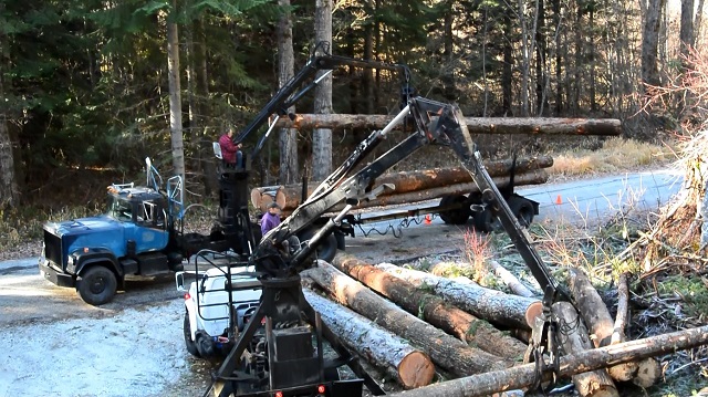 11/8/18 Robert has pulled the newest logs down from the bluff and is putting them in the log deck. Jack Van Puyen is on his self-loading log truck and is loading logs from the deck.