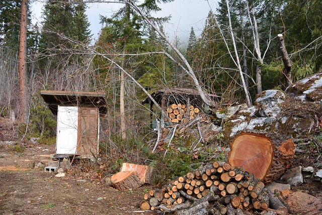 11/20/18 Before winter sets in and covers everything with snow, I took advantage of the nice weather to harvest a bunch of firewood that the loggers left for me. Here you can see some of the maple firewood rounds I have stored in the woodshed to cure. In the foreground you can also see a stack of small branches the loggers bucked up for me to use as firewood. That stack was hauled down and stacked under the cabin eaves for use this winter. For orientation, you can see the privy on the left and the high rock on the right of the woodshed.