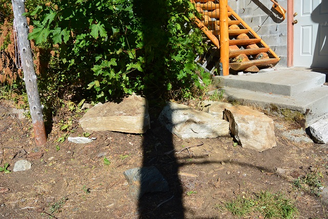 8/25/20 As part of cleaning out the crawl space in preparation for laying plastic on the floor, these rocks were dragged out through the door and placed here near the flag pole just to get them out of the way.