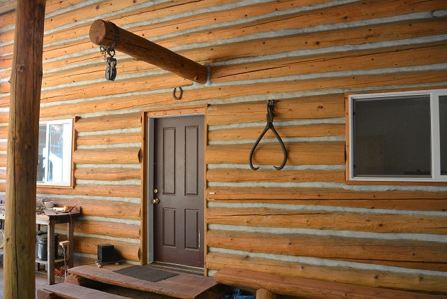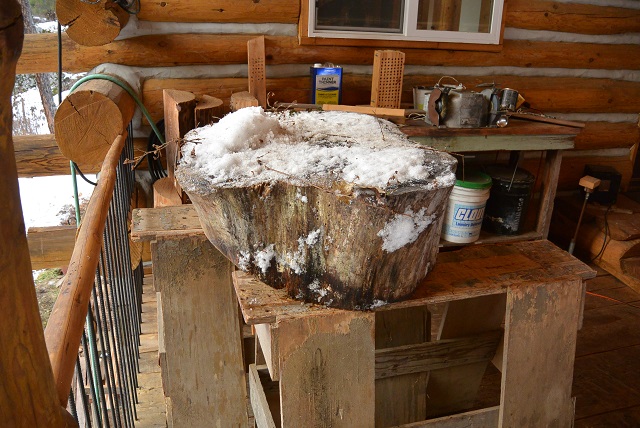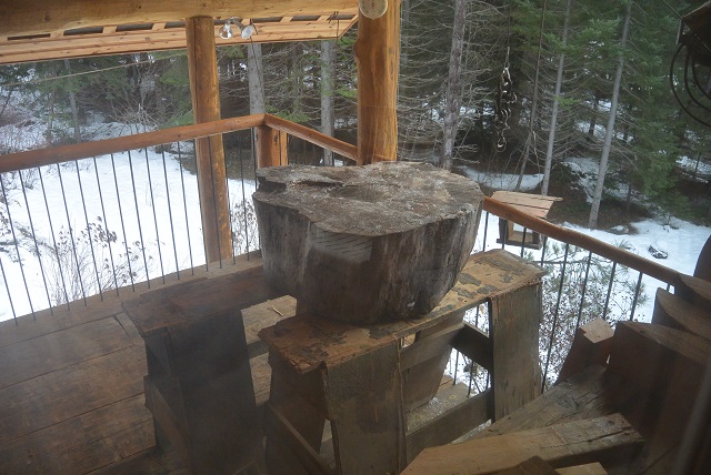12/3/20 This big pine block was dragged up from the hairpin turn and lifted up onto the front porch using the porch crane. The block will be used for a woodcarving project.