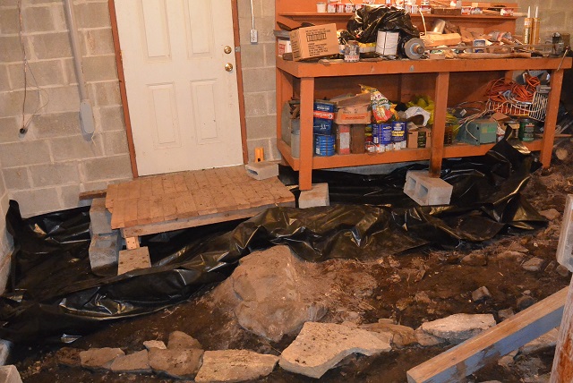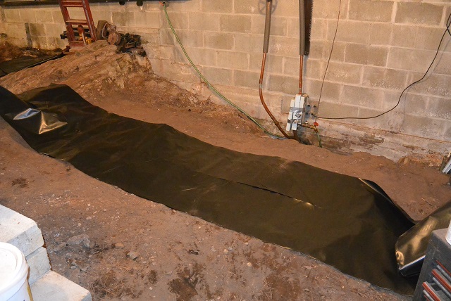 10/1/20 This is probably the easiest section of the floor because it is a fairly big area and can be covered by a fairly big sheet of plastic. The Gale installer helped me unroll and lay out the plastic. I will open it up and fit it against the walls, concrete pads, and rock outcroppings later at my leisure.