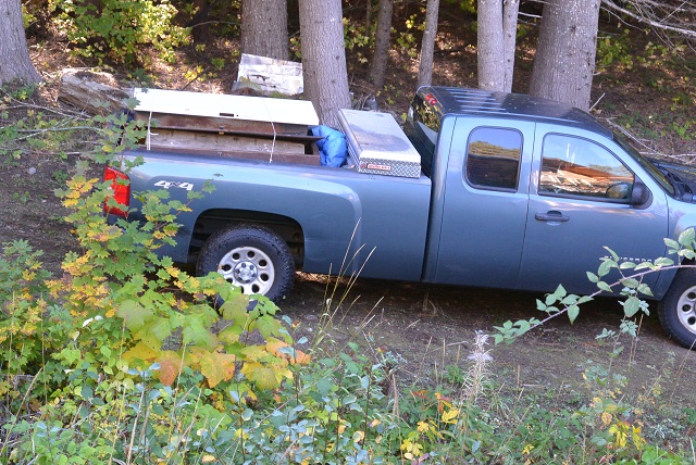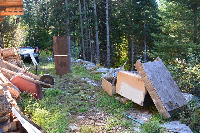 10/7/20 This is the nostalgic goodbye to some old, well-used junk. It is about to be loaded into the truck, which you can see with a ramp set up at the tailgate. The big wooden box was inherited from Leonard and was carried as a toolbox in the back of the truck until I set it up in the excavated crawl space where it sat as a toolbox until last week. I locked it up to protect chainsaws and other tools until I could lock the building up. Thieves broke the hasp at one point and stole two come-alongs, but otherwise nothing else was taken. The old metal freezer body was used as my waterproof cement storage locker since no roof was available to protect the cement from rain and snow. Leaning against it, is a wooden concrete mixing box that I used to mix the concrete for building the springbox. Various other junk is also waiting to be loaded into the truck.